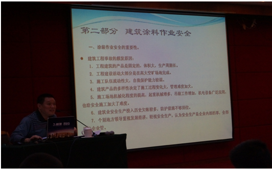 大会伊始,由广东省涂料行业协会黄开会长致辞。而后广东省涂装专业委员会黄永汉主任分别就<<2015年建筑涂装工作计划>>与<<建筑涂料涂装技术与管理>>作分析,黄永汉主任就实际商业运作过程容易出现的问题和注意事项重点解说,并回答现场企业代表就墙体脱落及附着力不够等现象的提问。让大家了解到涂料的质量及严格把控施工过程的重要性。