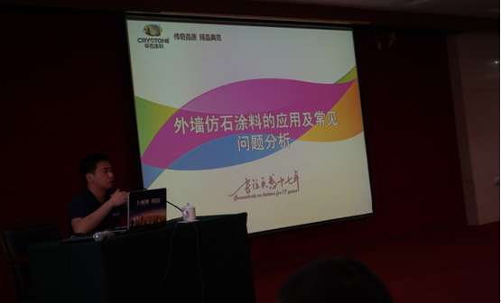 经过短暂的会休后,华石公司工程师就<<外墙仿石涂料的应用及常见问题分析>>向现场与会代表详细介绍。在45分钟里,工程师就华石涂料简介、仿砖涂料及其应用、仿石涂料施工工艺、常见施工问题的分析及处理等四个模块进行了精彩的演讲,展现出华石涂料精湛技术工艺,优质的产品和专业的服务,其中穿插的我公司自制的施工指导视频更是引起现场与会人员的极大兴趣。